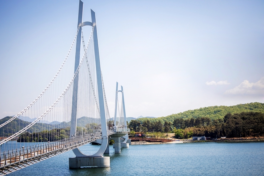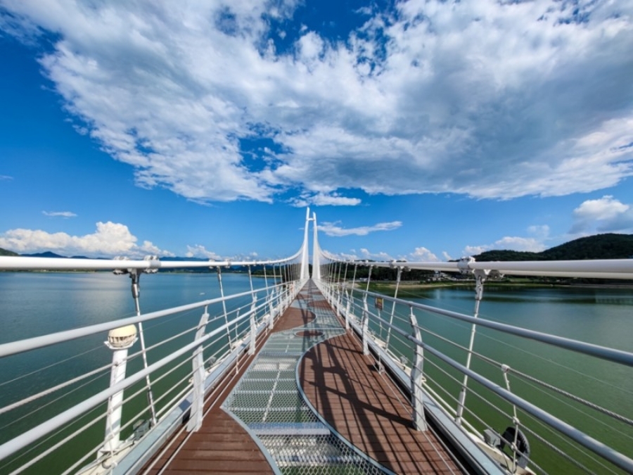 논산 탑정호는 충남에서 두 번째로 넓은 호수로, 물이 맑기로 유명하다. 이곳의 아름다운 풍광을 감상하며 자연 속에서 힐링할 수 있는 출렁다리가 2020년에 준공되었다. |