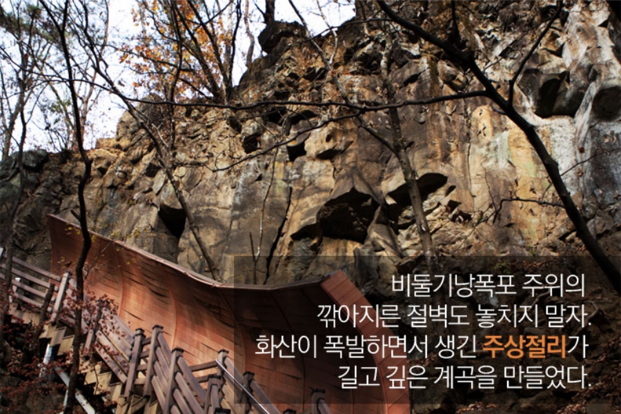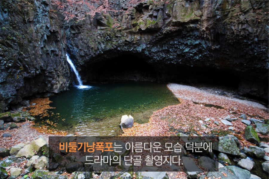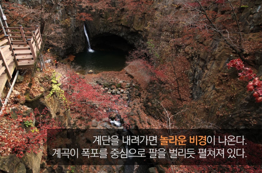 비둘기낭 폭포는 영북면 대회산리에 위치한 현무암 침식 협곡으로 불무산에서 발원한 불무천의 말단부에 위치해 있다. 비둘기낭이란 이름은 주변 지형이 비둘기 둥지처럼 움푹 들어간 주머니 모양을 하고 있다고 하여 비둘기낭 폭포라 부른다. 또 다른 설은 예전부터 양비둘기가 폭포 주변의 동굴에 서식하고 있다고 하여 비둘기낭이라 불린다고 전해진다. 예전 6.25 전쟁 당시에는 수풀이 우거지고 외부에 잘 드러나지 않아 마을주민의 대피시설로도 사용되었고, 군인들의 휴양지로도 사용되었다. 그러나 현재는 2012년 천연기념물로 지정되어 보호되고 있으며, 많은 관광객들에게 그 아름다움과 비경을 전하고 있다. 비둘기낭 폭포는 지질·지형학적으로 하식동굴, 협곡, 두부침식, 폭포 등 하천에 의한 침식 지형을 관찰할 수 있고, 주상절리, 판상절리 등 다양한 지질구조도 확인할 수 있다. 또한, 한탄강에 흐른 용암의 단위를 한눈에 관찰할 수 있어 학술적으로도 가치가 있다고 할 수 있다. |