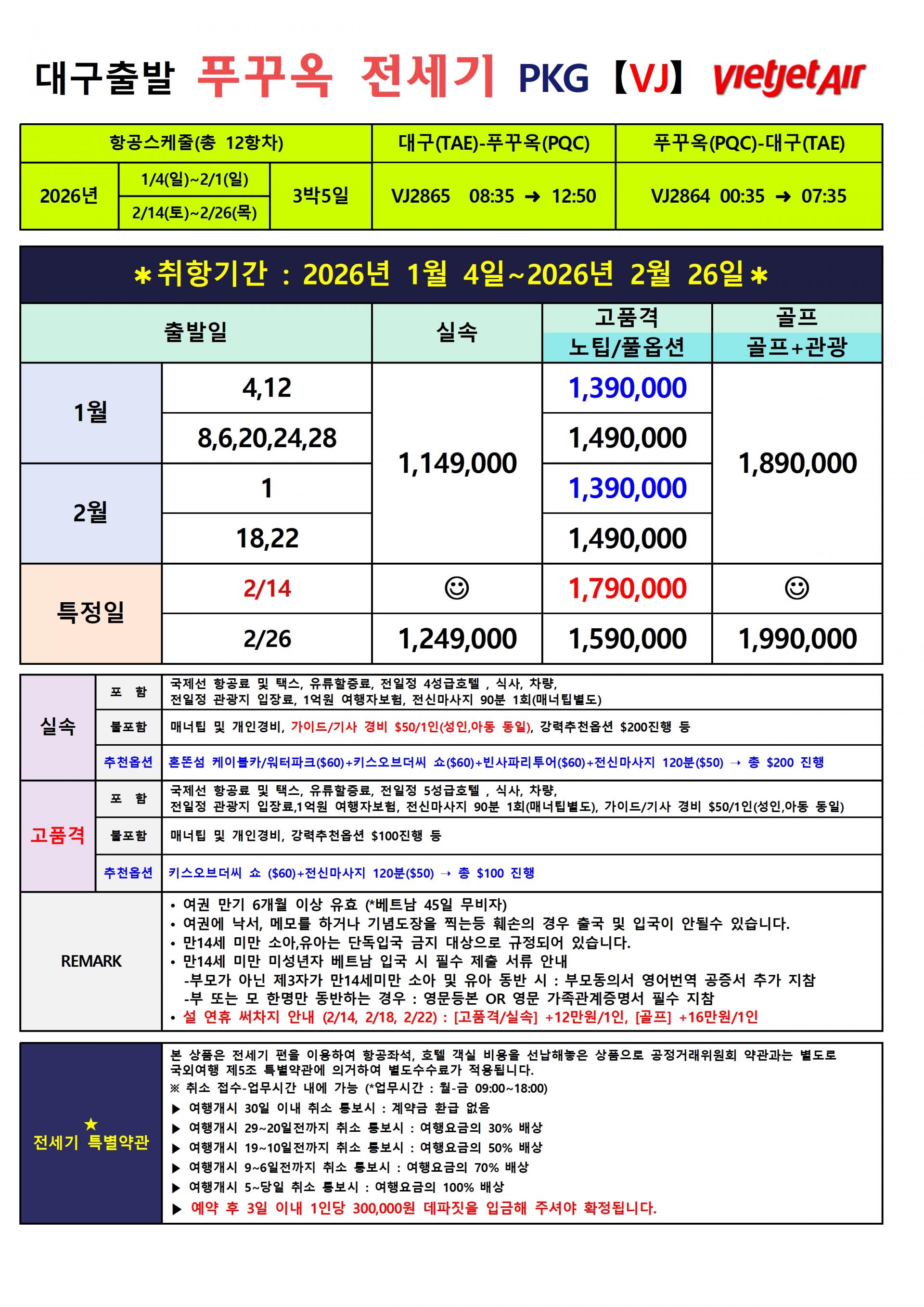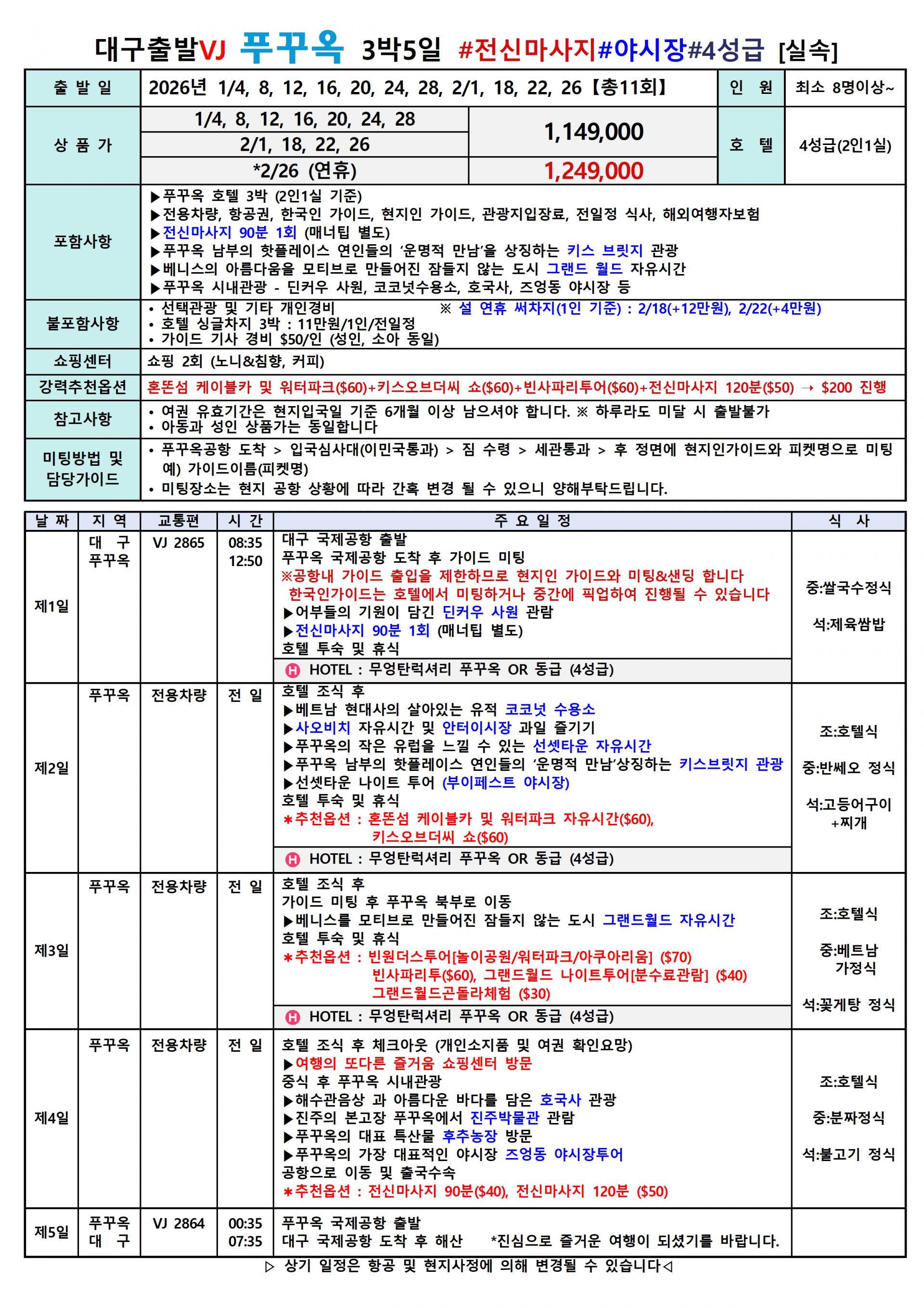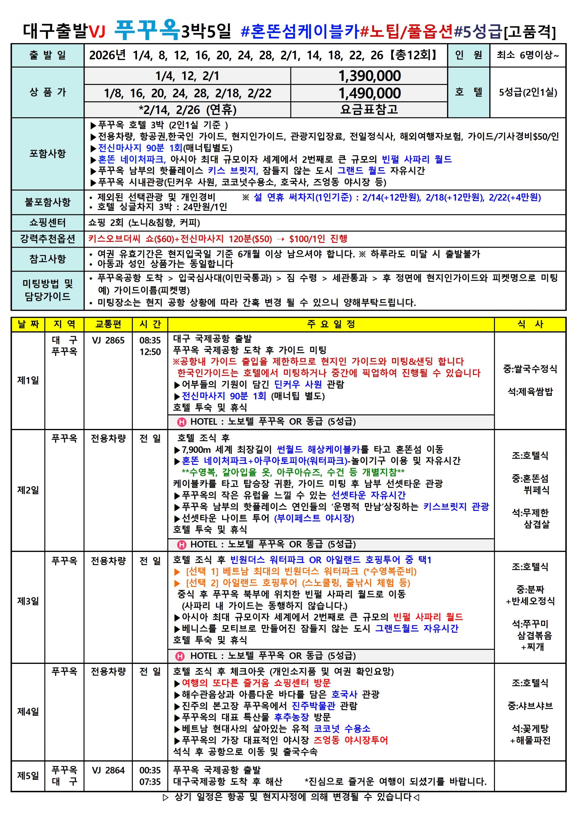 | 📢참고사항 ✔[고품격] 5성급호텔 1,390,000원~ 📍노팁/풀옵션 📍혼똔섬케이블카 📍전신마사지 90분 1회, 빈펄 사파리월드, 키스브릿지, 그랜드월드, 푸꾸옥 시내 관광 ✔[실속] 4성급호텔 1,149,000원~ 📍전신마사지 90분 1회 📍키스브릿지, 그랜드 월드, 푸꾸옥 시내관광 ✔[골프+관광] 5성급호텔 1,890,000원~ 📍전신마사지 60분 1회 📍푸꾸옥 골프 36홀 포함 📍그랜드월드, 푸꾸옥 시내관광 |