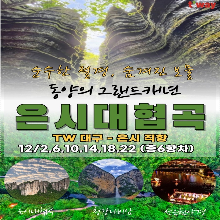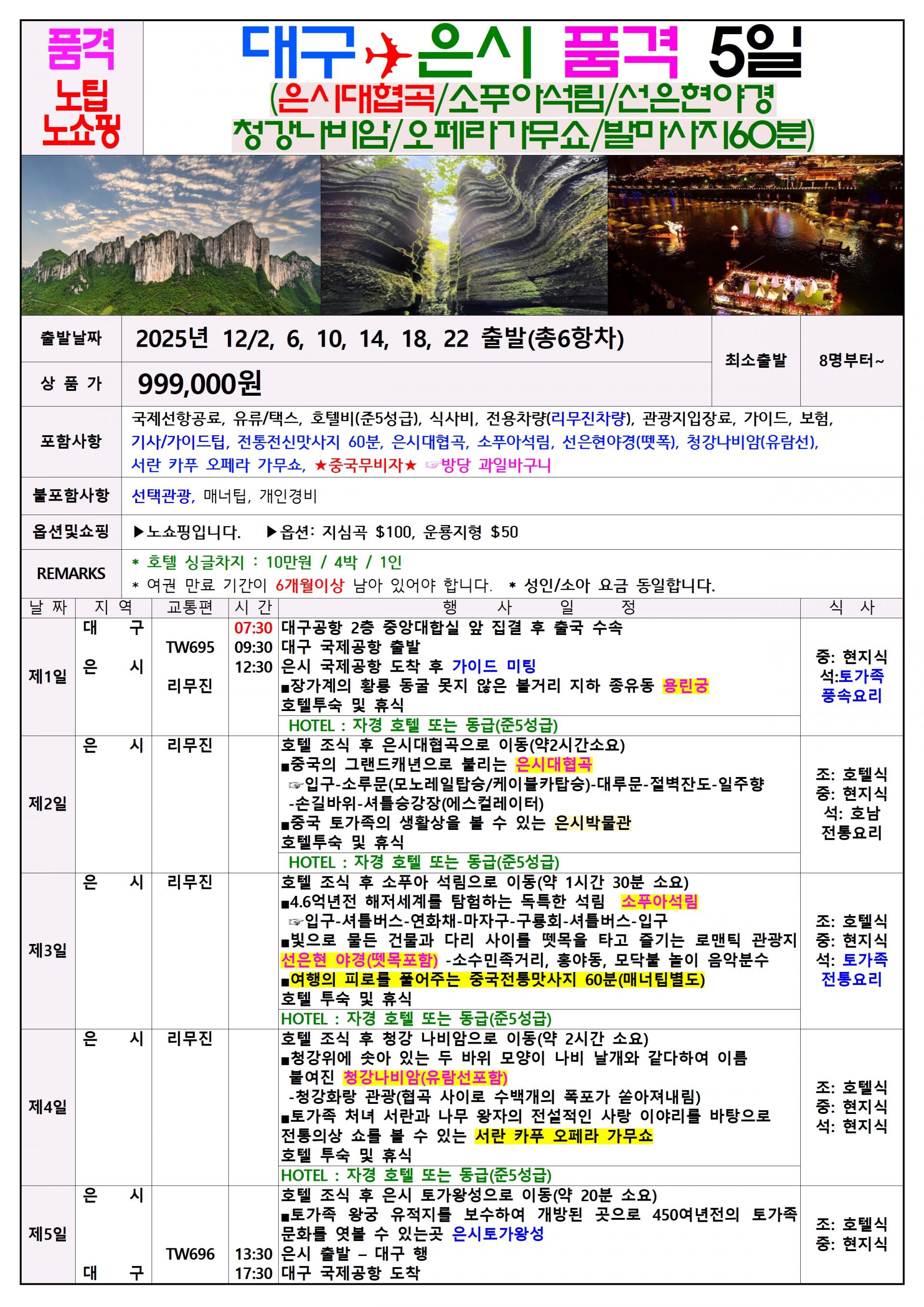 | 📢참고사항 ✨✨대구 출발 신규 관광지 은시대협곡!! ✨✨ ✨✨동양의 그랜드 캐년 은시대협곡✨✨ 💎구채구 보다 순수한 절경 💎웅장함에 한 번! 경이로움에 두 번 반할 관광지 👉출발일: 12/2,6,10,14,18,22 (백투백-4박 5일) 👉상품가: 999,000원