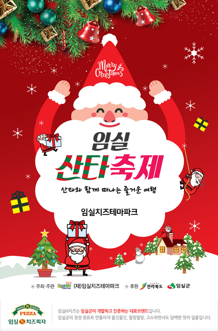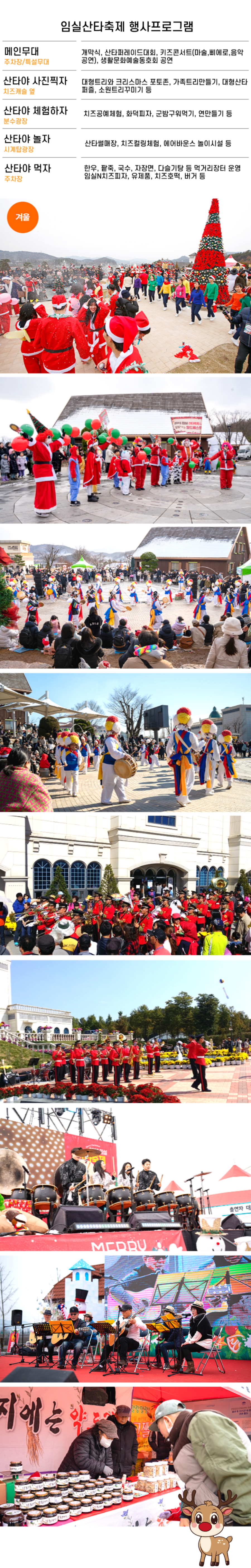 365일 동화속 치즈세상 임실치즈테마파크에서 열리는 임실 산타축제 대한민국 대표 크리스마스 겨울 축제! 가족, 연인, 친구와 특별한 추억 만들기 산타경연대회, 산타플래시몹퍼레이드, 마술공연, 칵테일공연등 다양한 공연 산타썰매장, 가족트리만들기, 치즈공예체험, 군밤구워먹기, 화덕피자등 체험 산타게임, 치즈컬링게임, 산타를 찾아라, 산타양말 소원적고 선물받기등 이벤트 즐기기 대형트리, 크리스마스 포토존, 광장 분수대, 예쁜 목장 산책로에서 인생샷 남기기 스위스 아펜젤러를 닮은 테마파크의 치즈캐슬, 치즈관, 테마관, 파크관 관람 |