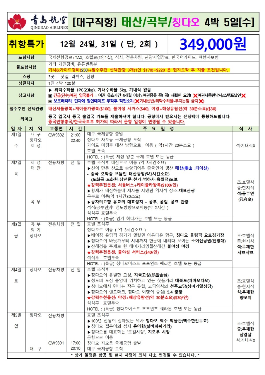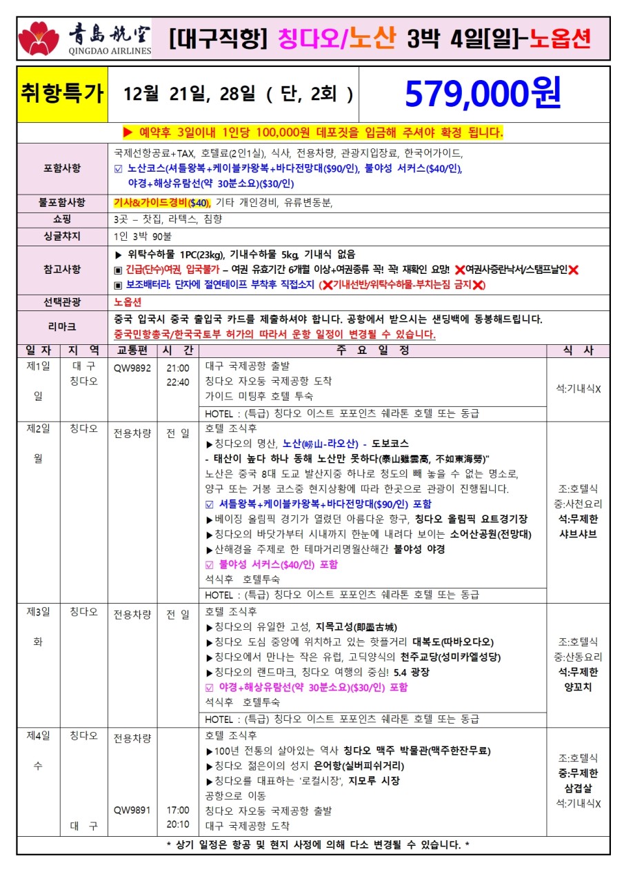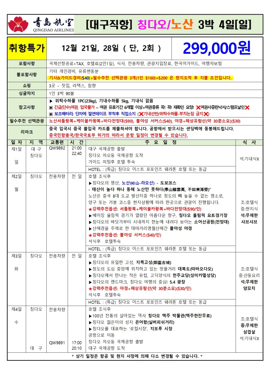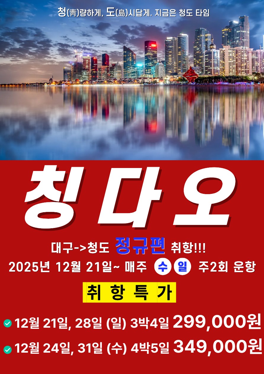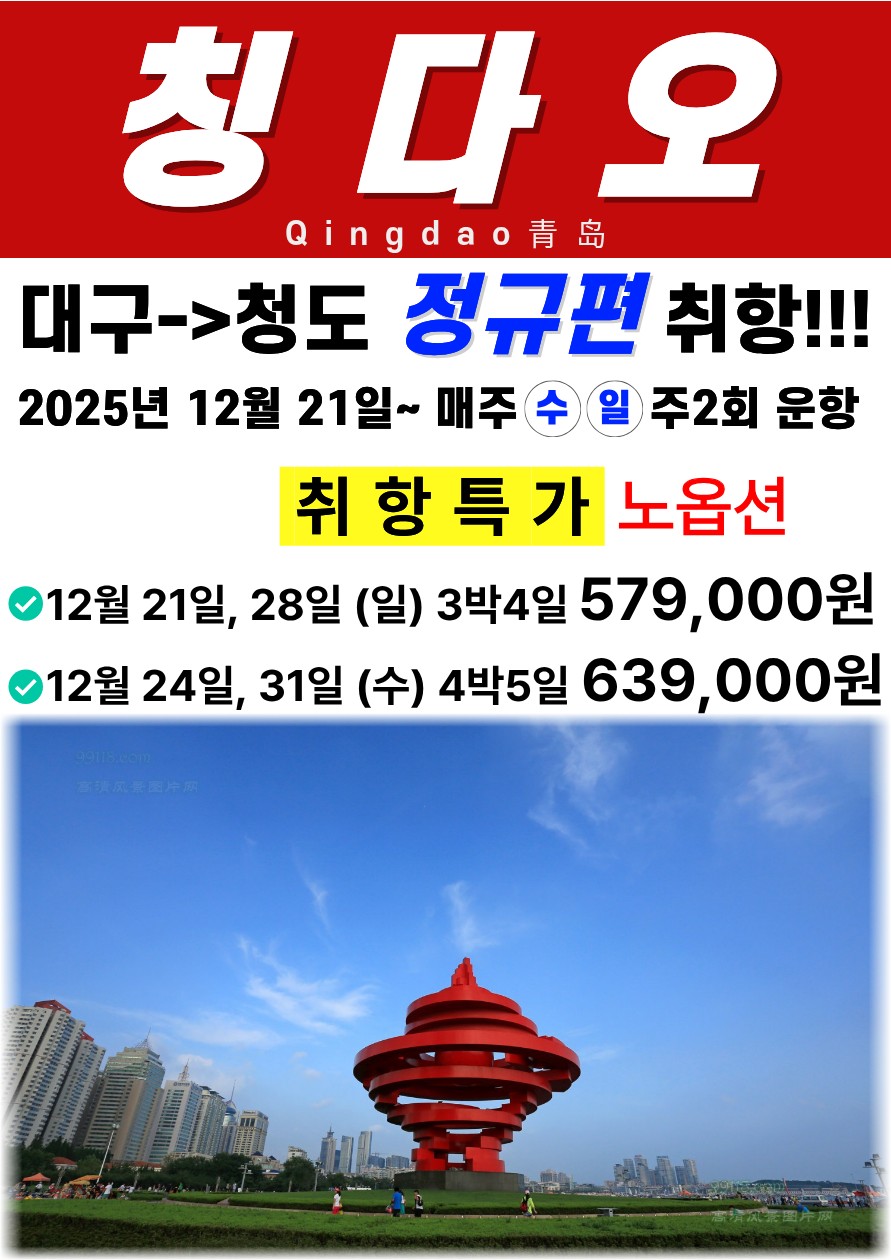 | 📢참고사항 📍 청도, 칭다오 (QingDao, 靑島) 12월 21일 부터 ✈️정규편으로 운항 확정!! 대구에서 칭다오까지 정규직항편으로 편하게 다녀오세요~! 주 2회 운항(수-4박 5일, 일-3박 4일)