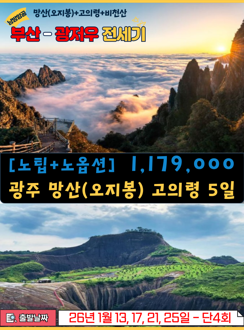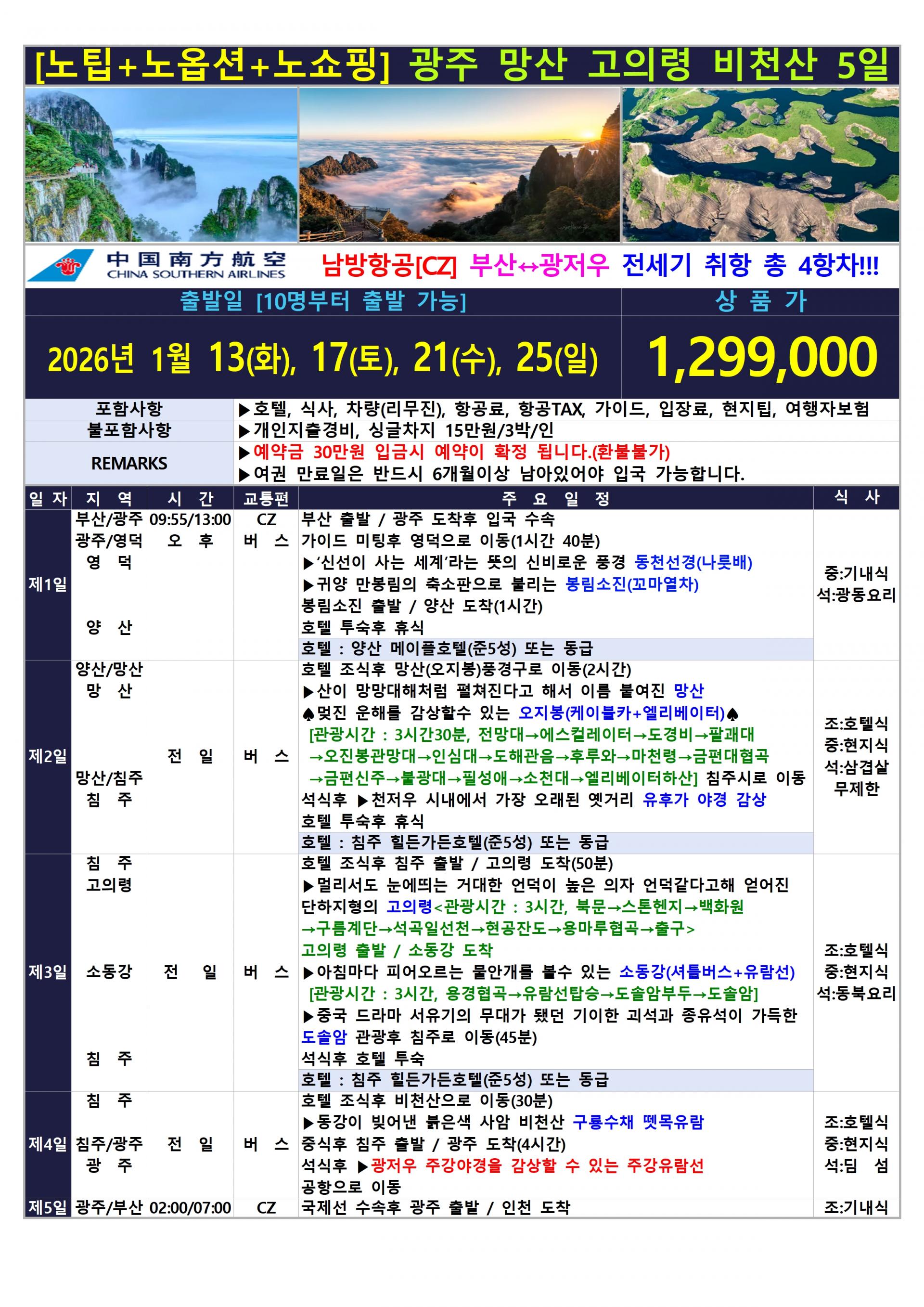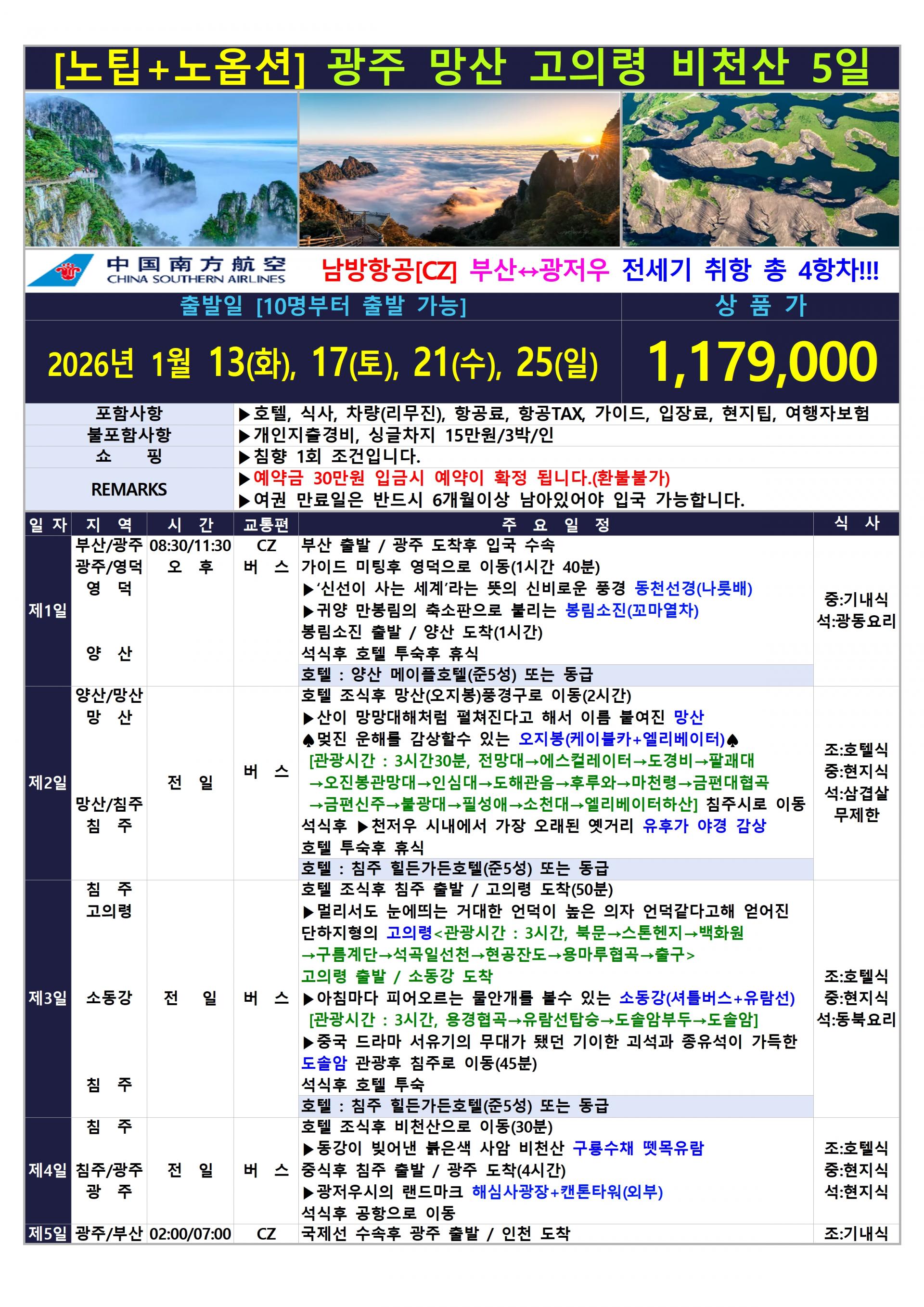 | 📢참고사항 ♣부산↔광저우 남방항공 전세기 상품입니다♣ ★[노팁+노옵션] 광주 망산 고의령 5일★ ▶출발 : 26년 1/13,17,21,25일 – 총4항차 |