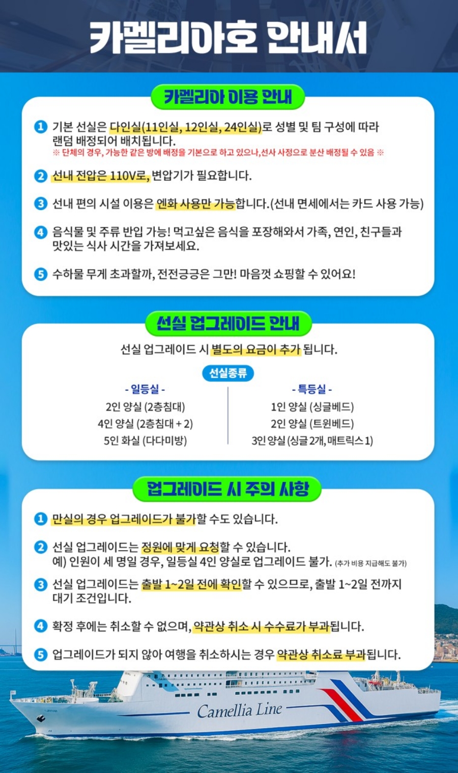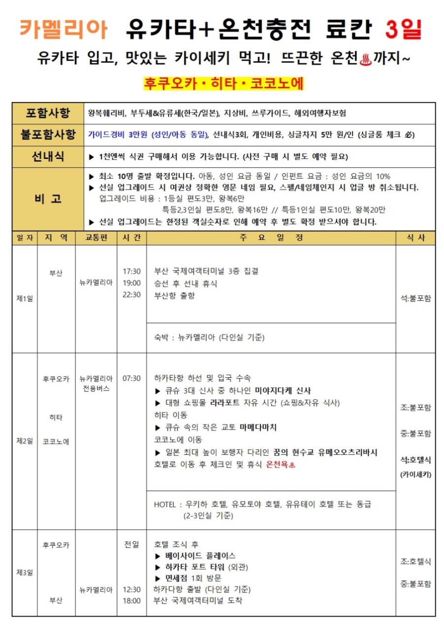 | 📢참고사항 추운 겨울이면 생각나는 노곤노곤~ 온천♨️ 유카타도 입고, 카이세키도 먹으면서 따뜻하게 즐기자 ! 📍 2026년 3~4월 예상가 업데이트 완료 ! 🚢 [카멜리아] 유카타X온천 충전 료칸팩 3일 🚢 ⭐ 최저가 289,000원~ ✔️ 10명 이상 출발 확정 ✔️ 🛳 출발일: 18:00 부산 신국제여객터미널 집결 🛳 도착일: 18:30 부산 신국제여객터미널 도착 *선실 업그레이드는 요청 조건입니다.* 🎁 카멜리아 POINT 🎁 ✨ 부산 출발 후쿠오카 선박 여행 ✨ 저녁 출발로 퇴근 후 바로 떠나기 GOOD! ✨ 오락실, 노래방, 레스토랑 등 다양한 즐길거리 ✨ 배 안에서 자유롭게 식사 및 주류 반입 가능 ✨ 수하물 무게 제한도 비교적 자유로워, 마음 편하게 쇼핑까지! 🛍 🎁 온천 충전 료칸팩 POINT 🎁 ✨ 가성비로 떠나는 알찬 2박 3일 ✨ 일정 마무리 후 따끈한 온천욕 ♨ ✨ 유카타 입고 즐기는 일본 료칸 숙소와 맛있는 카이세키까지! ✨ 큐슈 3대 신사 중 하나인 미야지다케 신사 ✨ 신상 대형 종합 쇼핑몰 라라포트 자유 관광 ✨ 큐슈 속의 작은 교토, 마메다마치 ✨ 일본 최대 높이 다리인 꿈의 현수교, 유메오오츠리바시 지금 바로 떠나요 ~🛳️ |