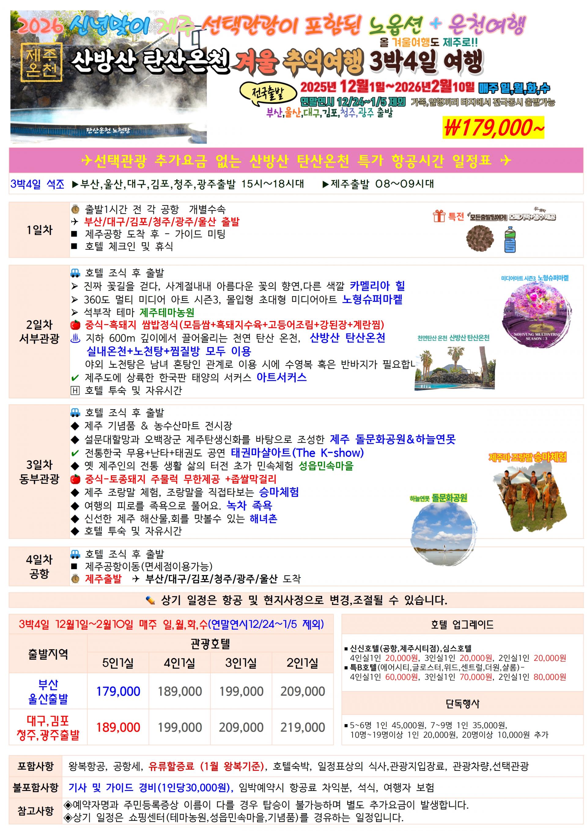 | 📢참고사항 2026년 신년맞이 🥇배보다 배꼽이 큰 선택관광이 없고 아니 포함된 노옵션 + 온천여행 산방산 탄산온천+노천탕 제주 온천여행 ♨️올겨울 여행도 제주로 떠나보자!! 🍀✈️ 지하600m 천연 탄산온천 노천탕+찜질 📌역대급 가성비 25년12월1일~26년 2월10일 매주일,월,화,수 ☃️ 제주관광과 온천여행을 동시에...🎁 🏃♂️빠른 예약이 필수입니다.🏃♀️ 👍출발하시는 모든팀에 오메기떡+생수 서비스
