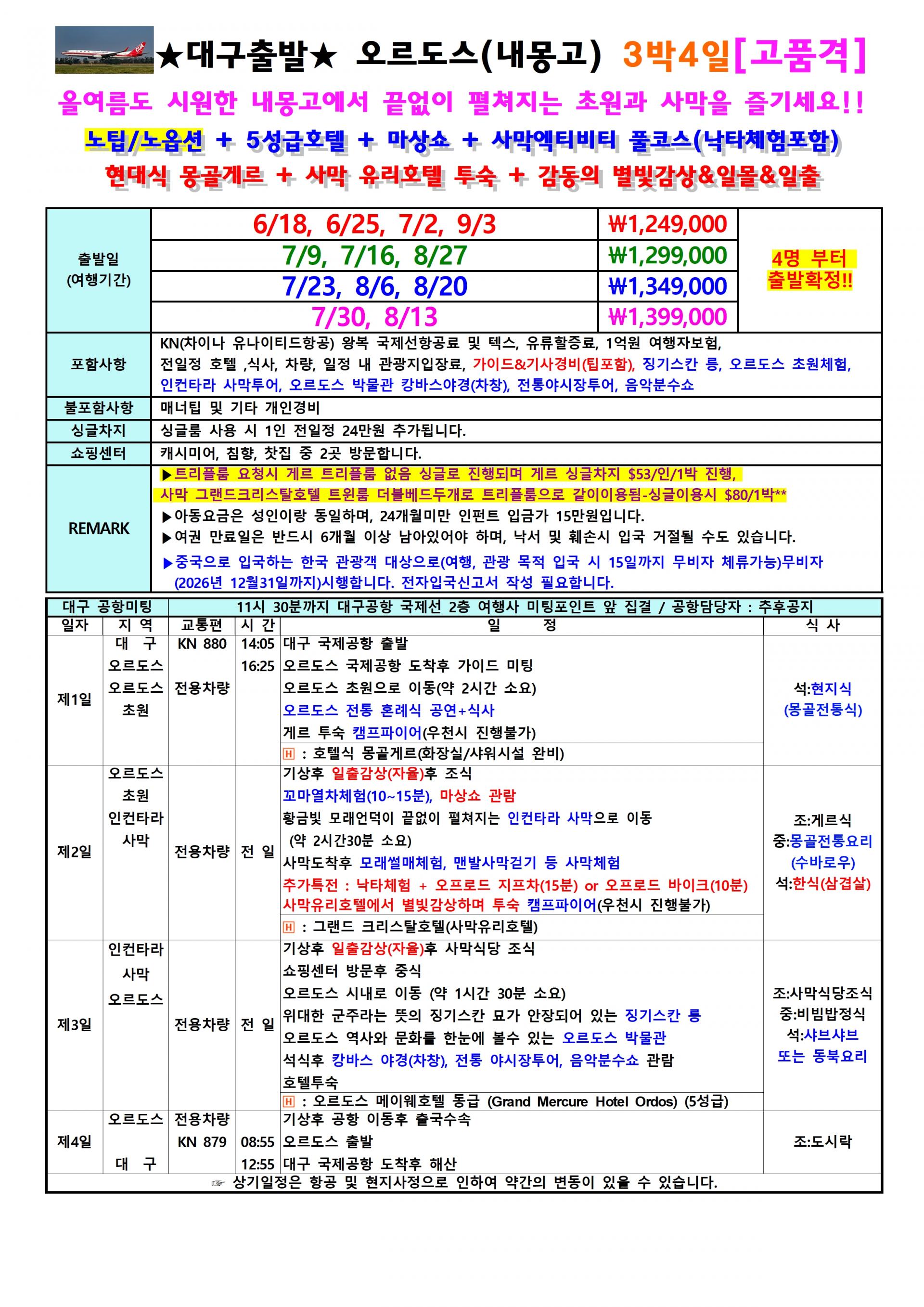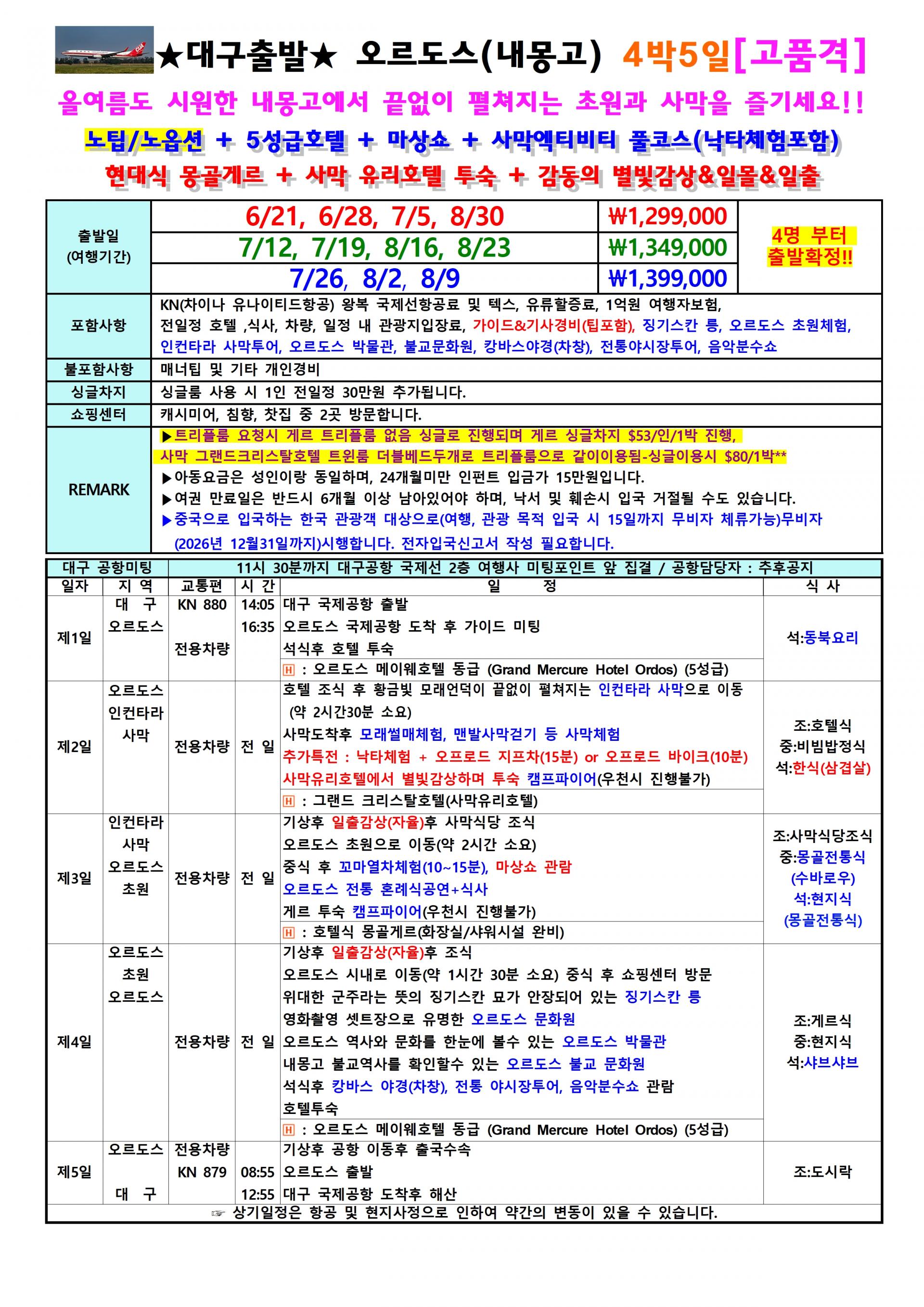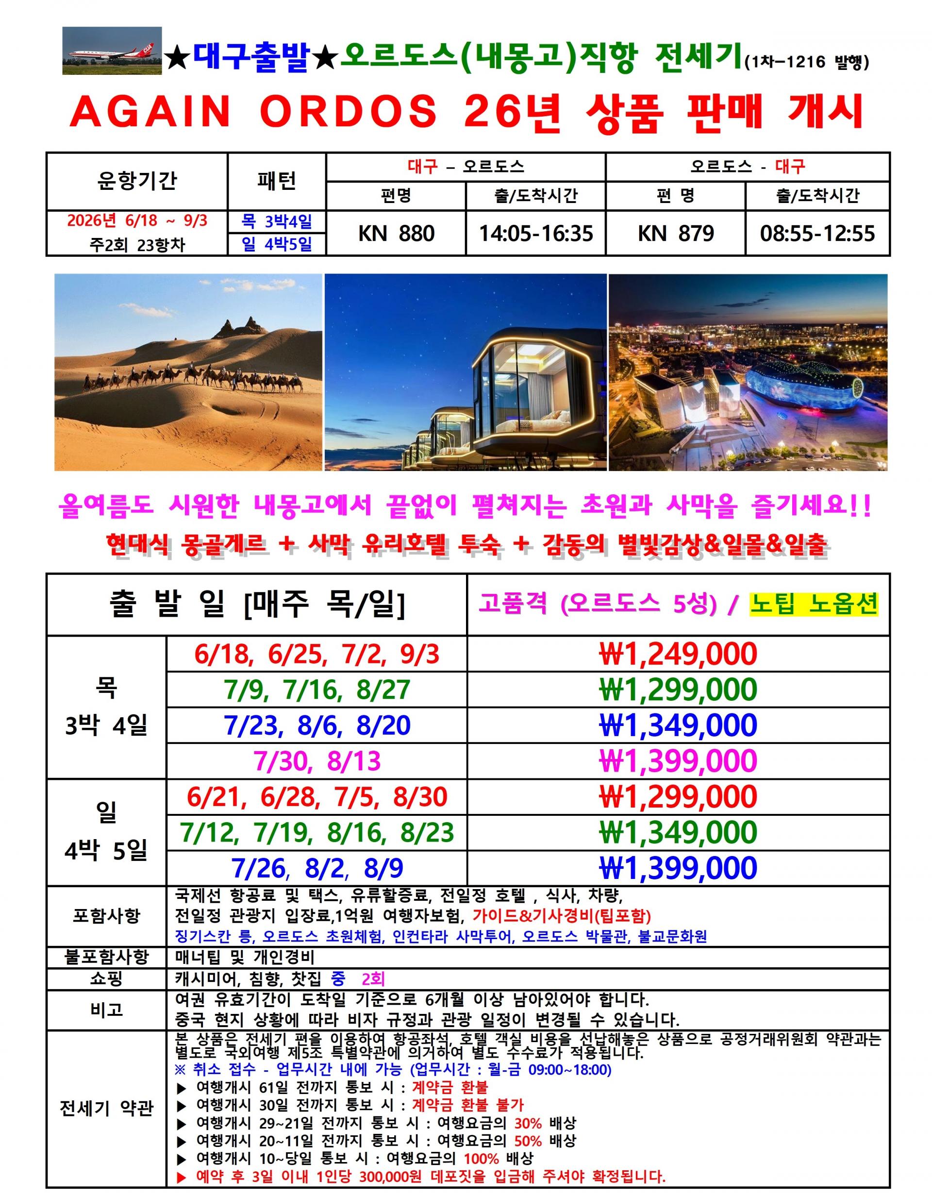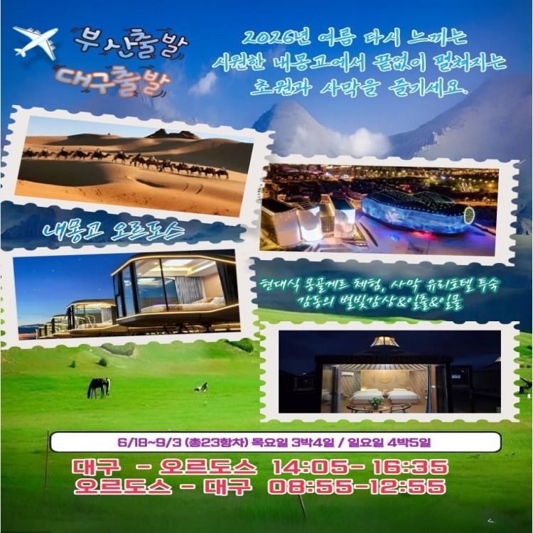| 📢참고사항 🎁 2026년 6월 18일 ~ 9월 3일 🎁 🎁 [KN항공] 대구직항 -오르도스(내몽고) 전세기취항 🎁 초원관광과 사막체험을 다 할수 있는 곳 오르도스 |