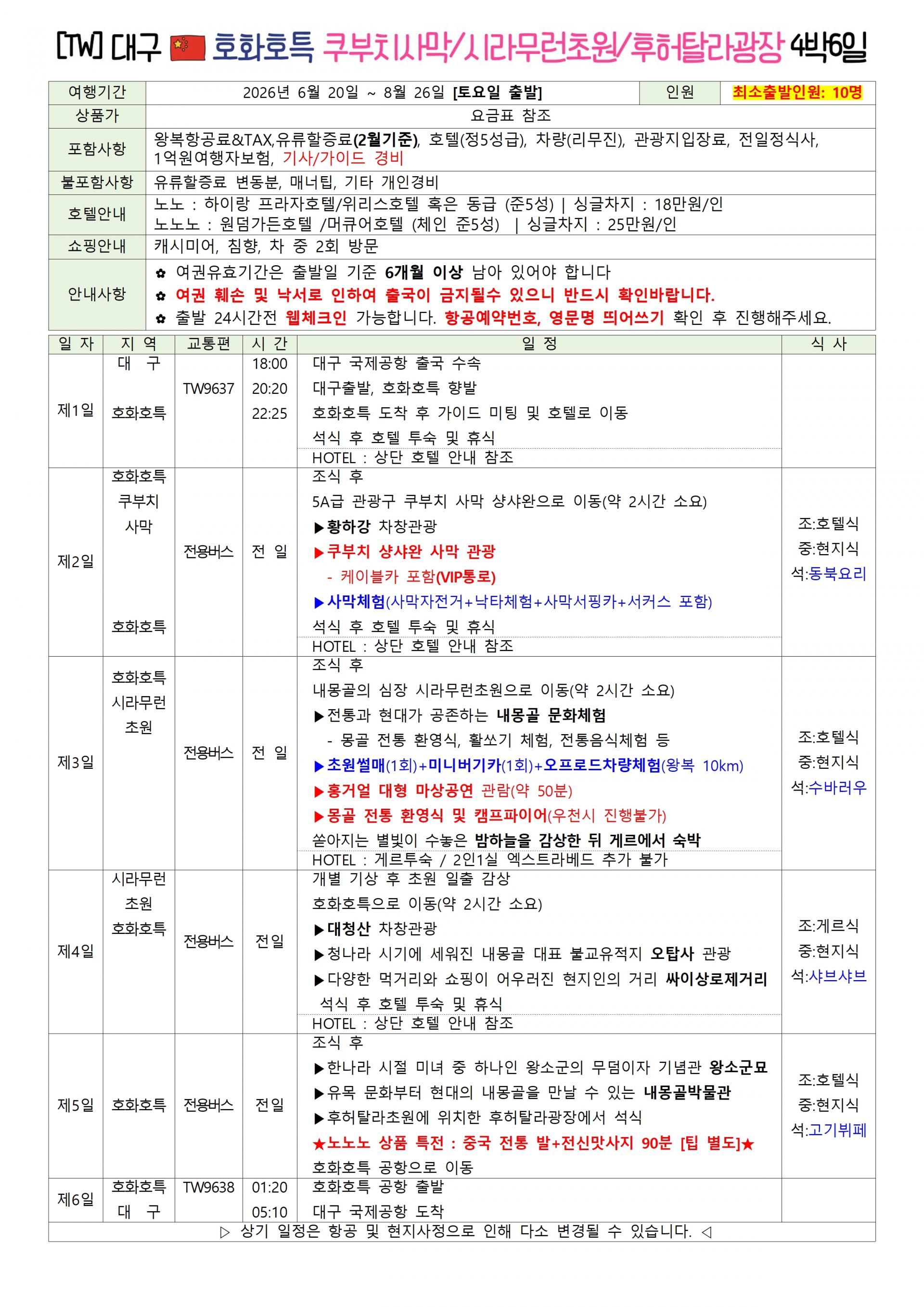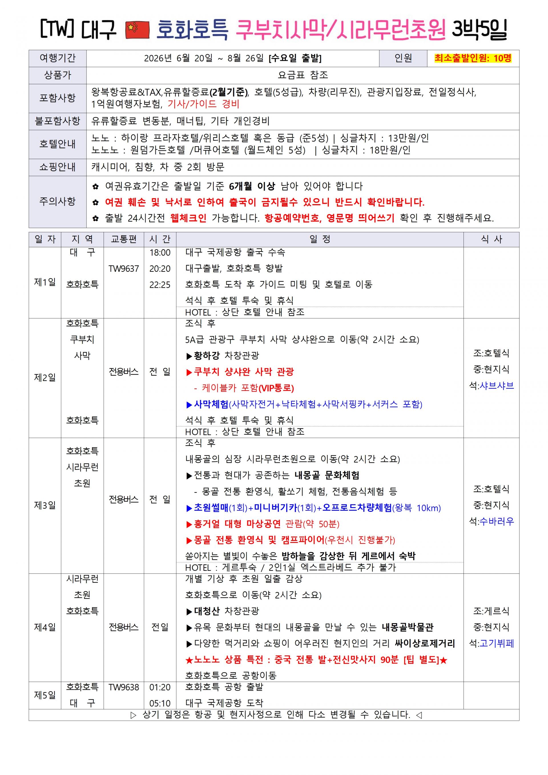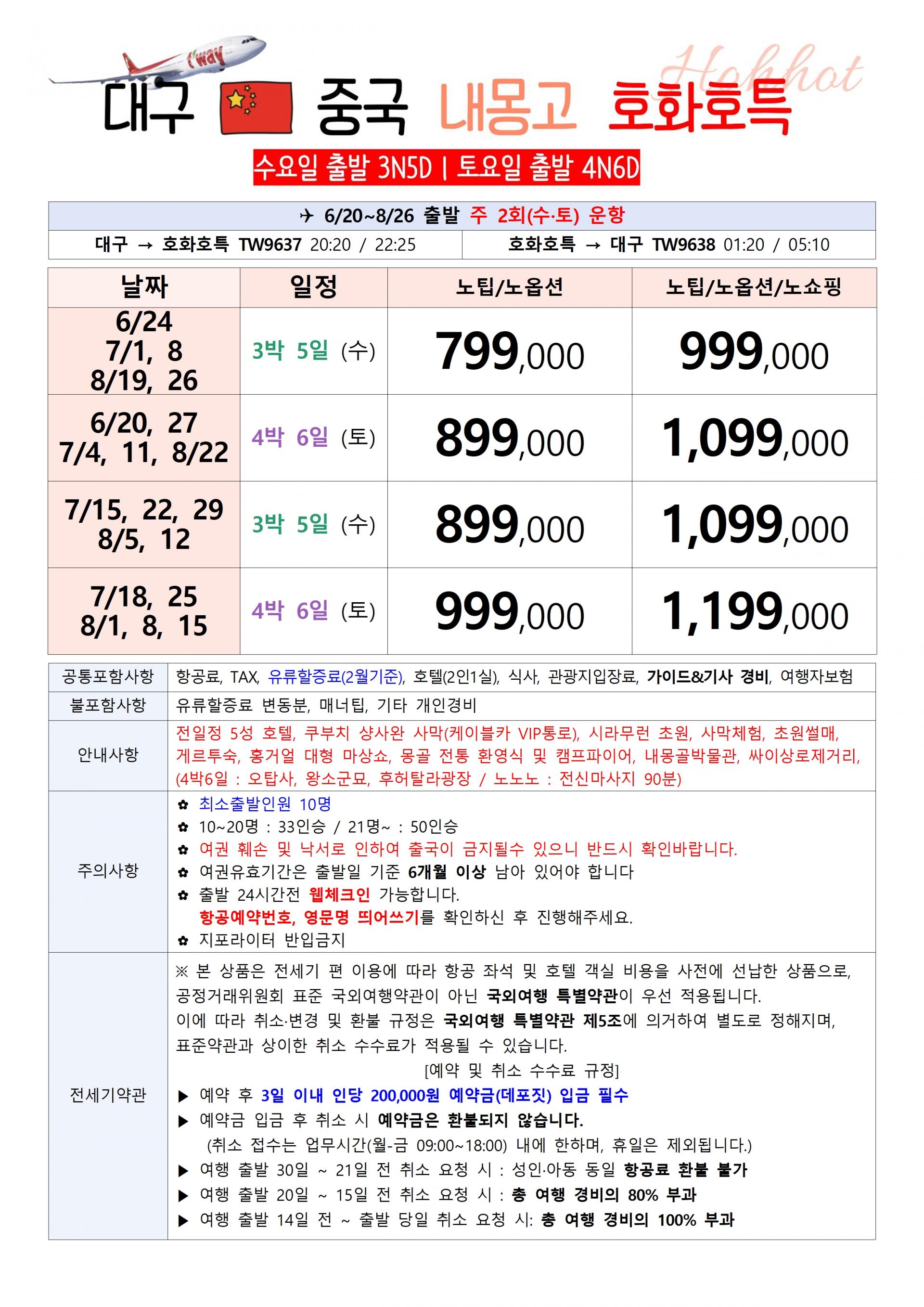 | 📢참고사항 ⭐ 대구✈️ 호화호특 3박5일/4박6일 ⭐ |