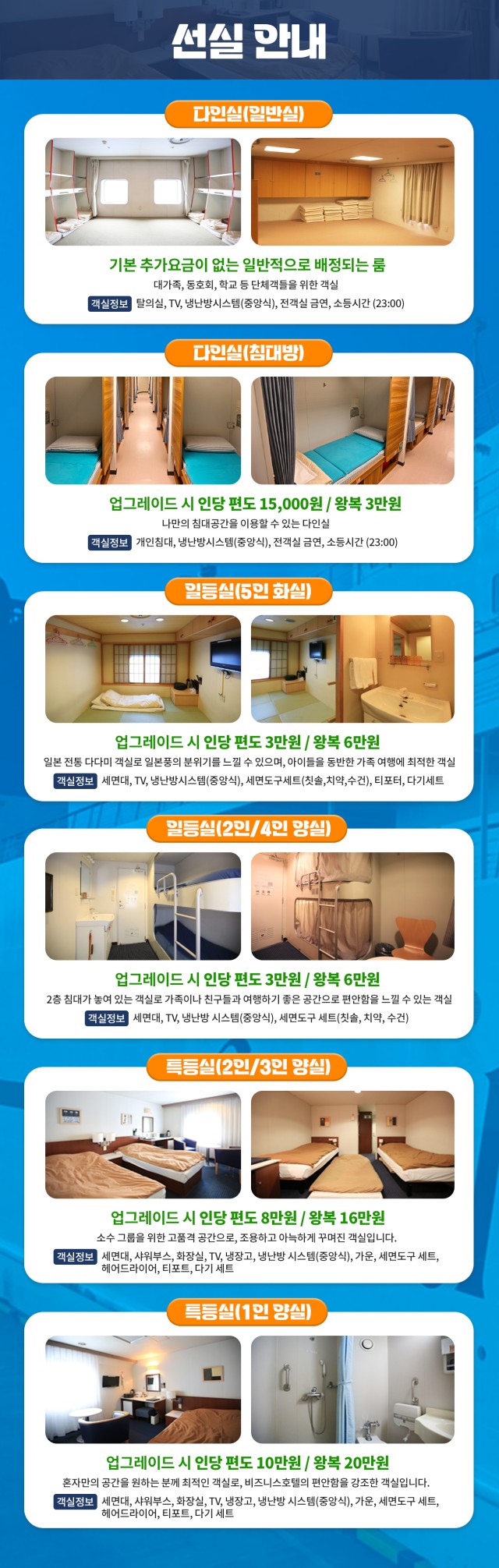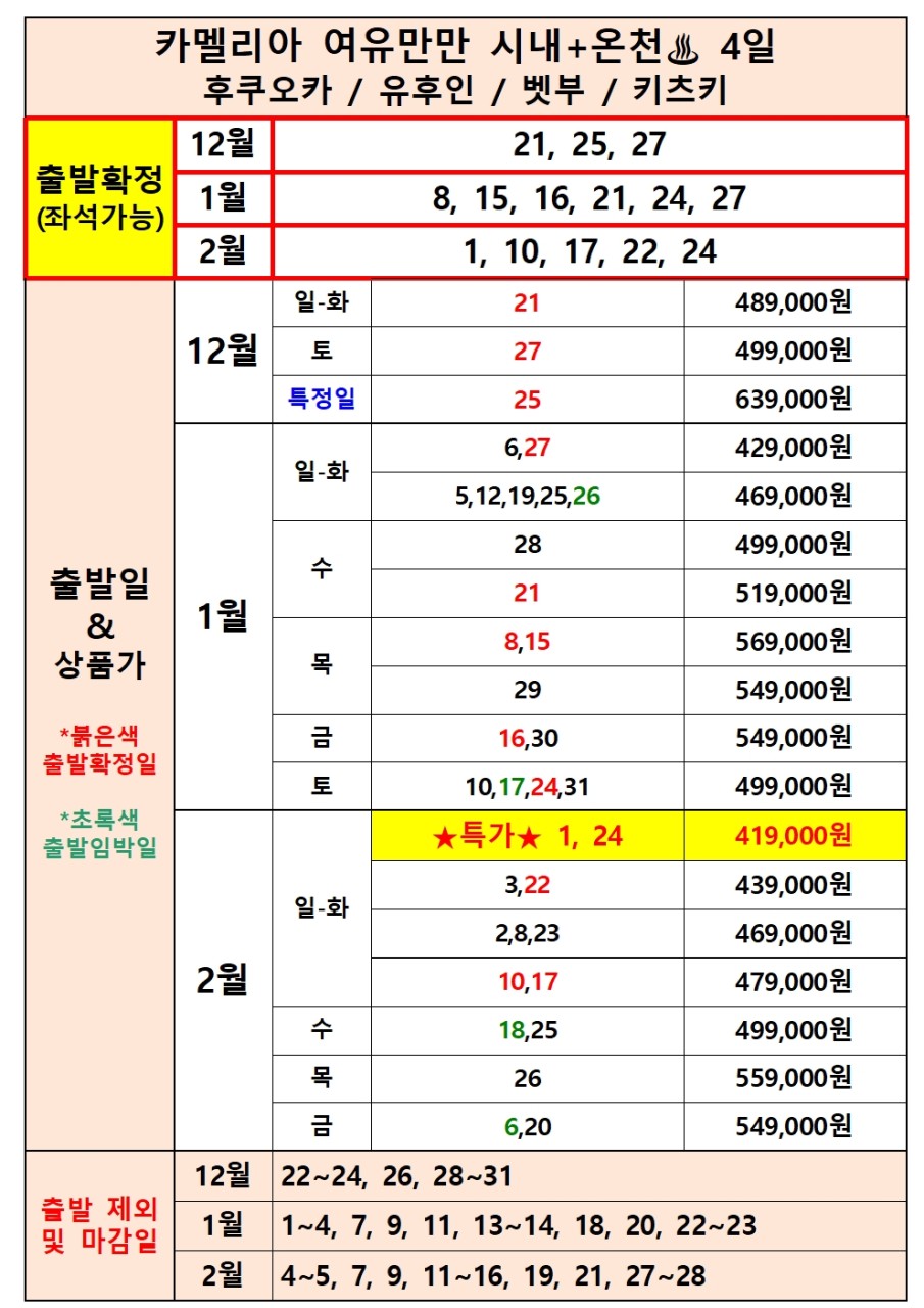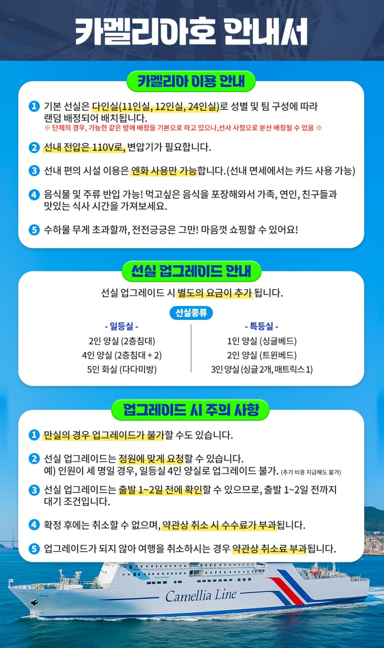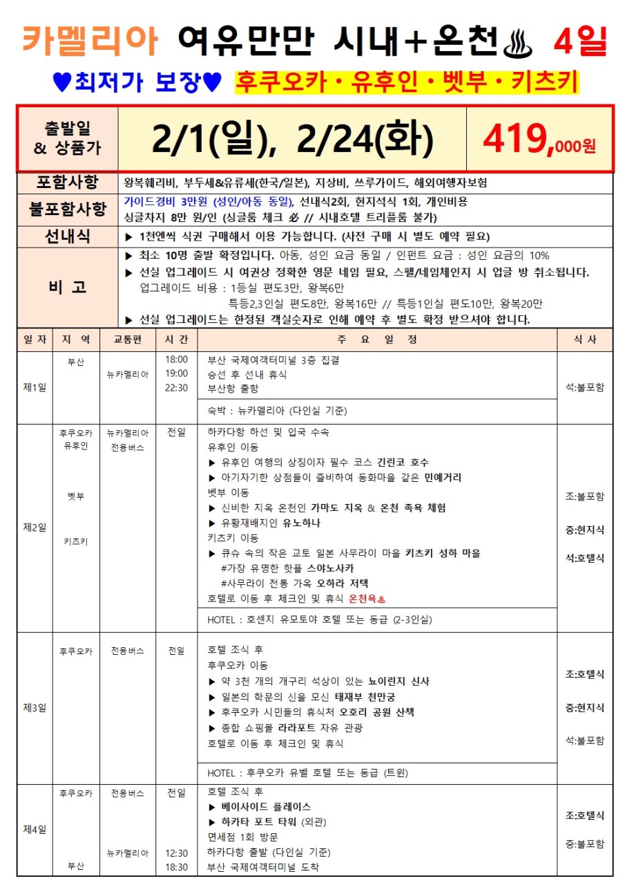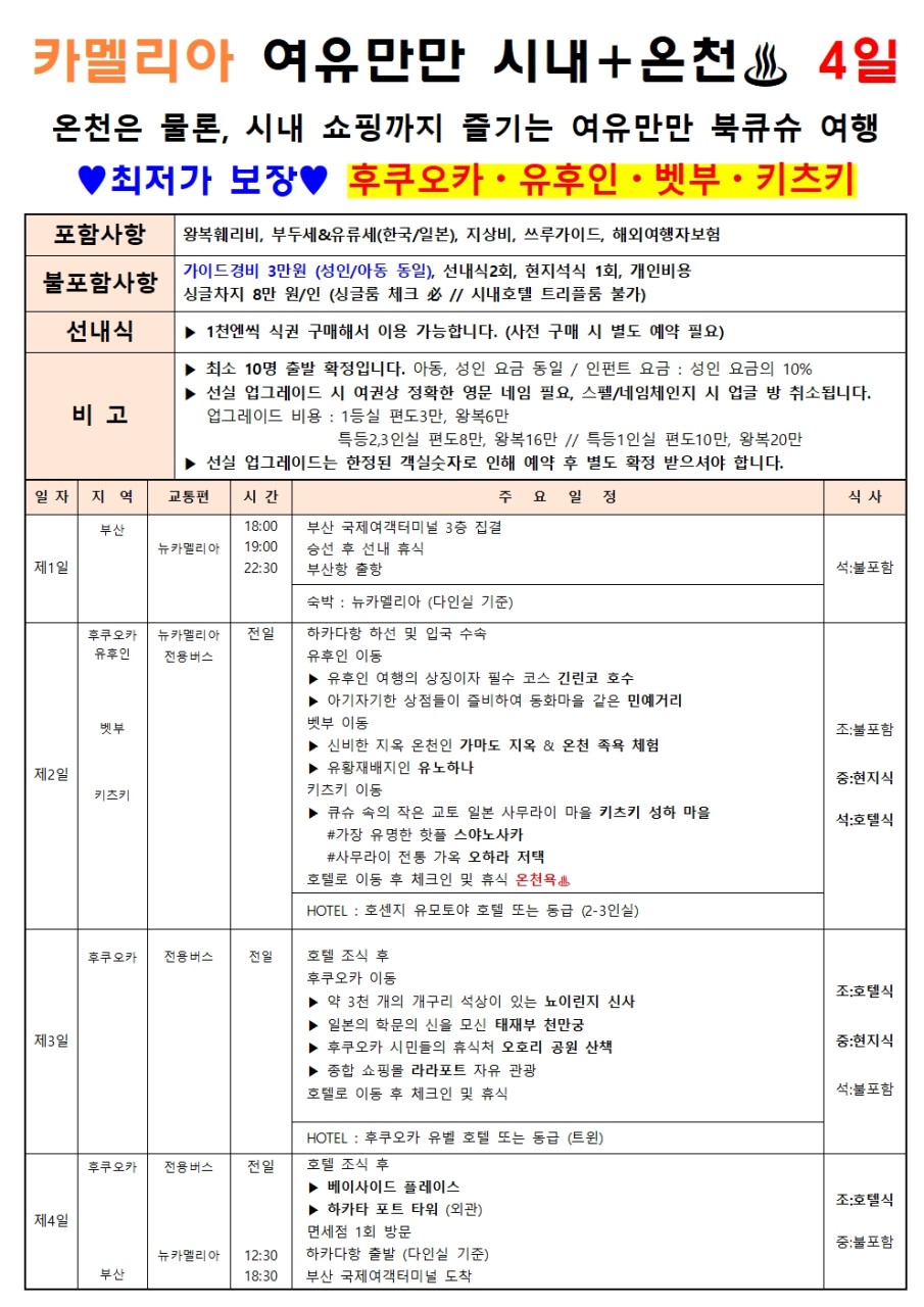 | 📢참고사항 🧳 관광지 CHECK POINT 🧳 🌫️ 유후인 여행의 상징이자 필수 코스 긴린코 호수 🧸 아기자기한 상점들이 즐비하여 동화마을 같은 민예거리 ♨️ 신비한 지옥 온천 가마도 지옥 ⛩️ 약 3천 개의 개구리 석상이 있는 뇨이린지 신사 #일본 📚 학문의 신을 모신 태재부 천만궁 🏞️ 후쿠오카 시민들의 휴식처 오호리 공원 🛍️ 종합 쇼핑몰 라라포트 자유 관광 📸 쇼핑•먹거리•포토 스팟, 베이사이드 플레이스 🚢 카멜리아 CHECK POINT 🚢 ✨ 부산 출발, 저녁 출발 → 선상에서 숙박 후 일본 도착 🎮 오락실, 노래방, 레스토랑 등 다양한 즐길거리 🍣 자유로운 식사 및 주류 반입 가능 🛍️ 수하물 무게 제한도 비교적 자유로워 쇼핑도 편하게! 🛳️ 출발일 | 18:00 부산국제여객터미널 집결 🛳️ 도착일 | 18:30 부산국제여객터미널 도착 ※ 선실 업그레이드는 요청 조건 입니다 ※ 지금 바로 탑승하세요~🚢❤️ |