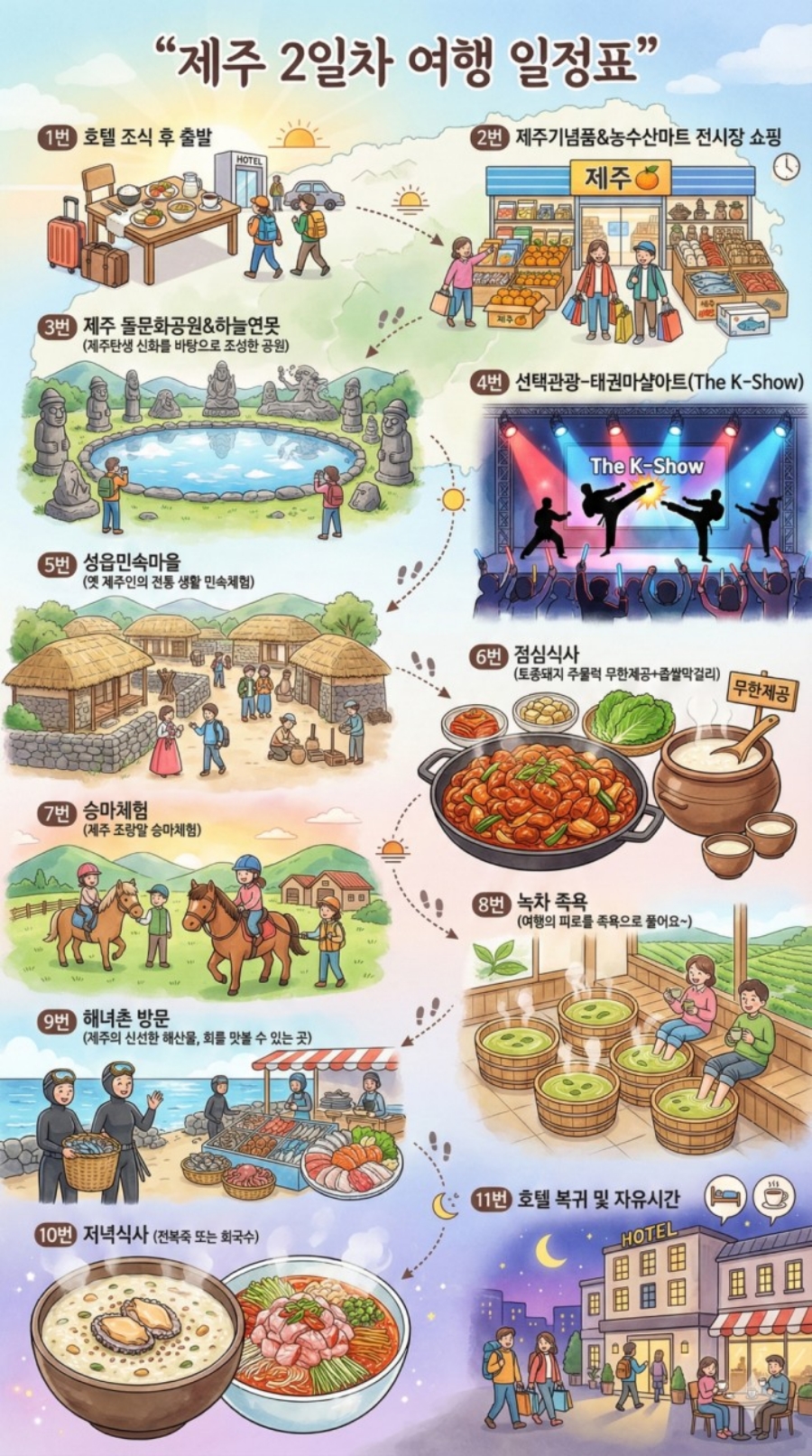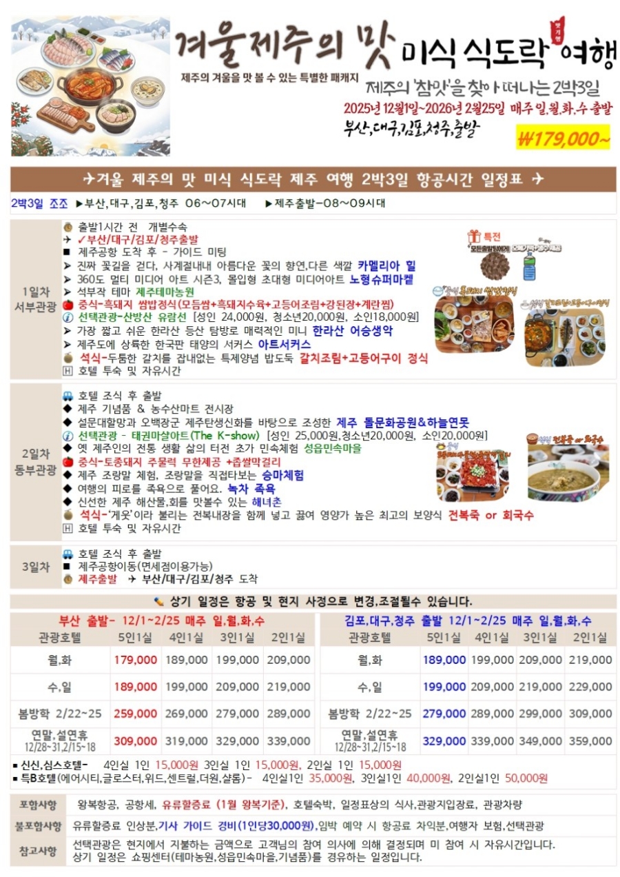 | 📢참고사항 🌅2026년 신년맞이 겨울 제주의 맛👍 제주의 겨울을 맛 볼 수 있는 특별한 패캐지 🥧식도락 테마여행🥣 🥗맛기행 식도락 여행🍨 🥙제주의 '참맛'을 찾아 떠나는 2박3일😁 맛있는 음식에 여행의 기쁨은 두배!! 🍜제주향토음식 다양한 청정재료들을 가장 신선한 상태에서 만들어 제주의 자연을 품은 맛 향토음식 매력속으로.. ✈️여행에서 빼놓을 수 없는 것이 바로 먹거리 관광, 제주의 아름다운 자연과 먹거리 일석이조 테마여행 🧳 🌻 가족,친지,모임 일행끼리 타지에서 출발가능 🏃♂️빠른 예약이 필수입니다.🏃♀️ ✈️전국(부산,대구,김포,청주)출발 🗓25년 12월1일~26년2월25일 매주 일,월,화,수 🏨 관광호텔,특급호텔 다 가능 📣기사가이드 팁 1인 30,000원 💰 상품가 2박3일 179,000원~ |