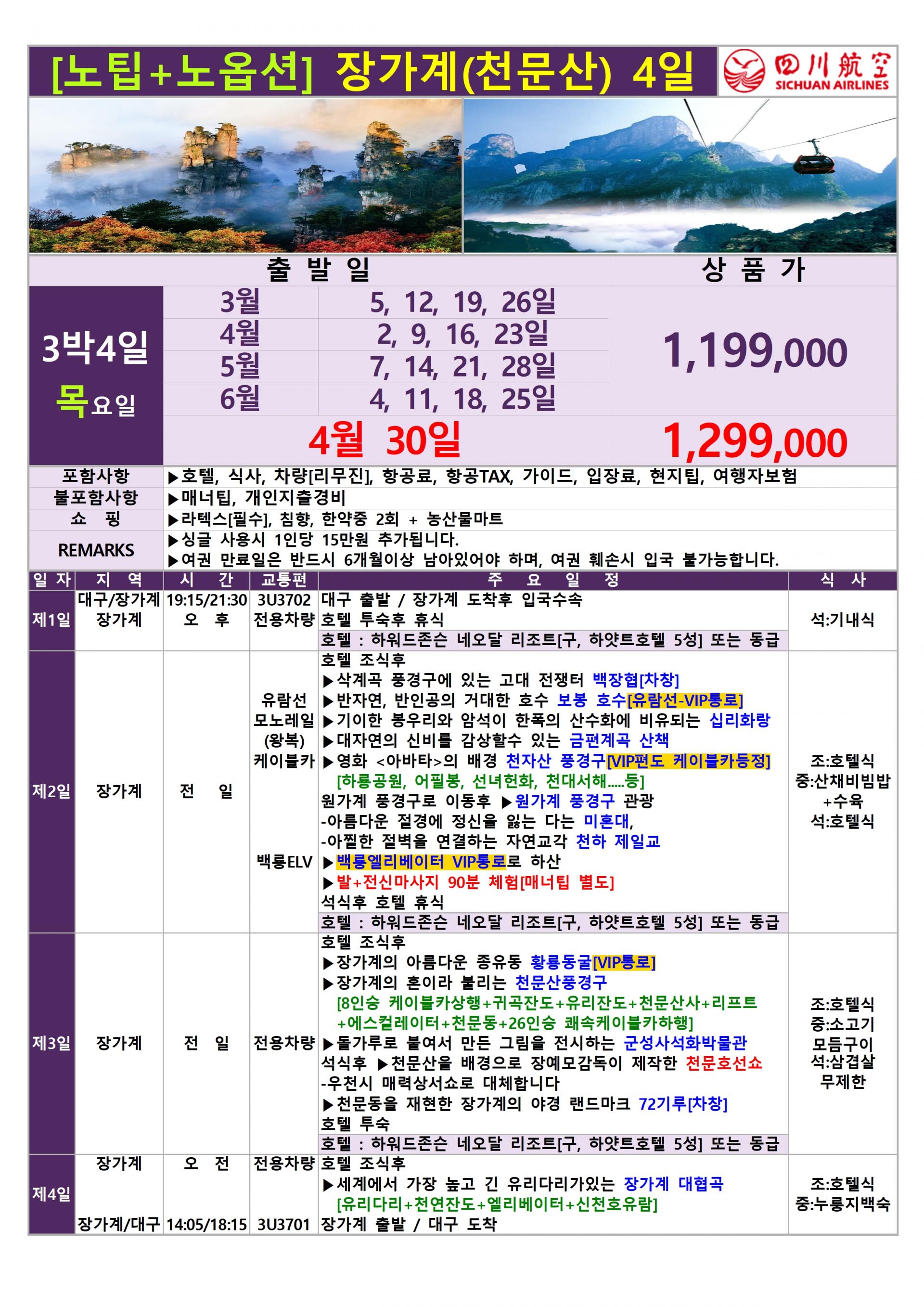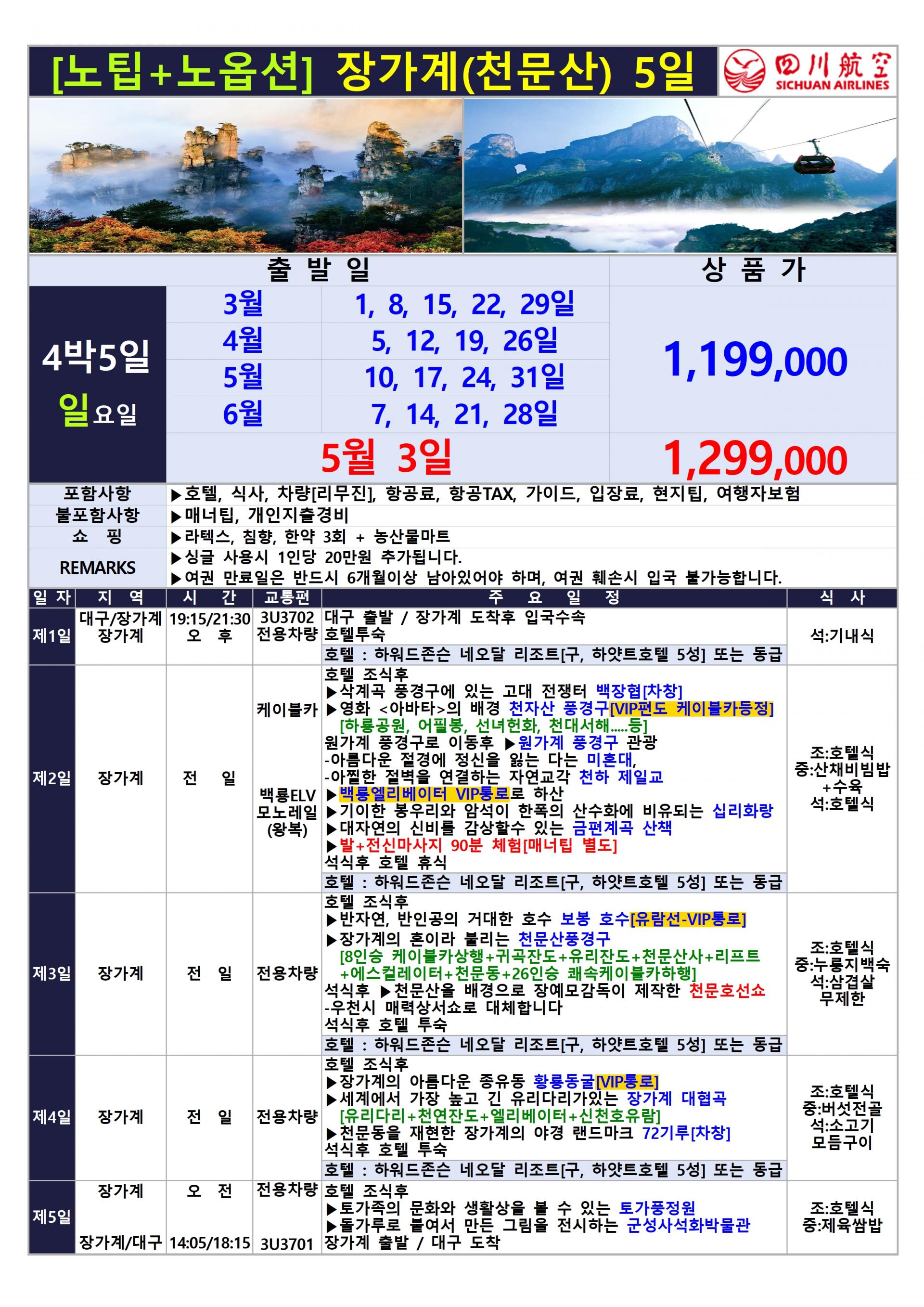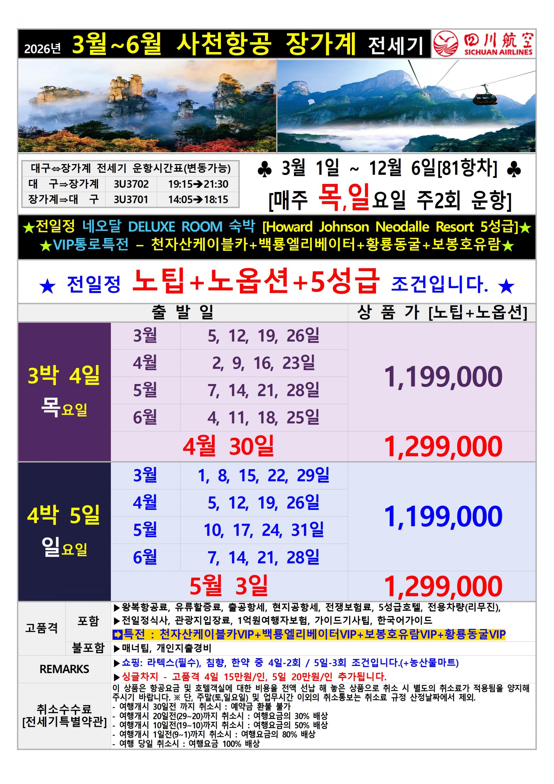 ★ 2026년 대구출발 사천항공 장가계전세기 상품입니다.★