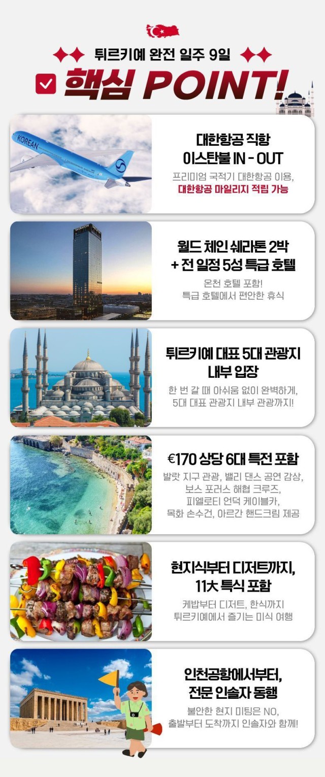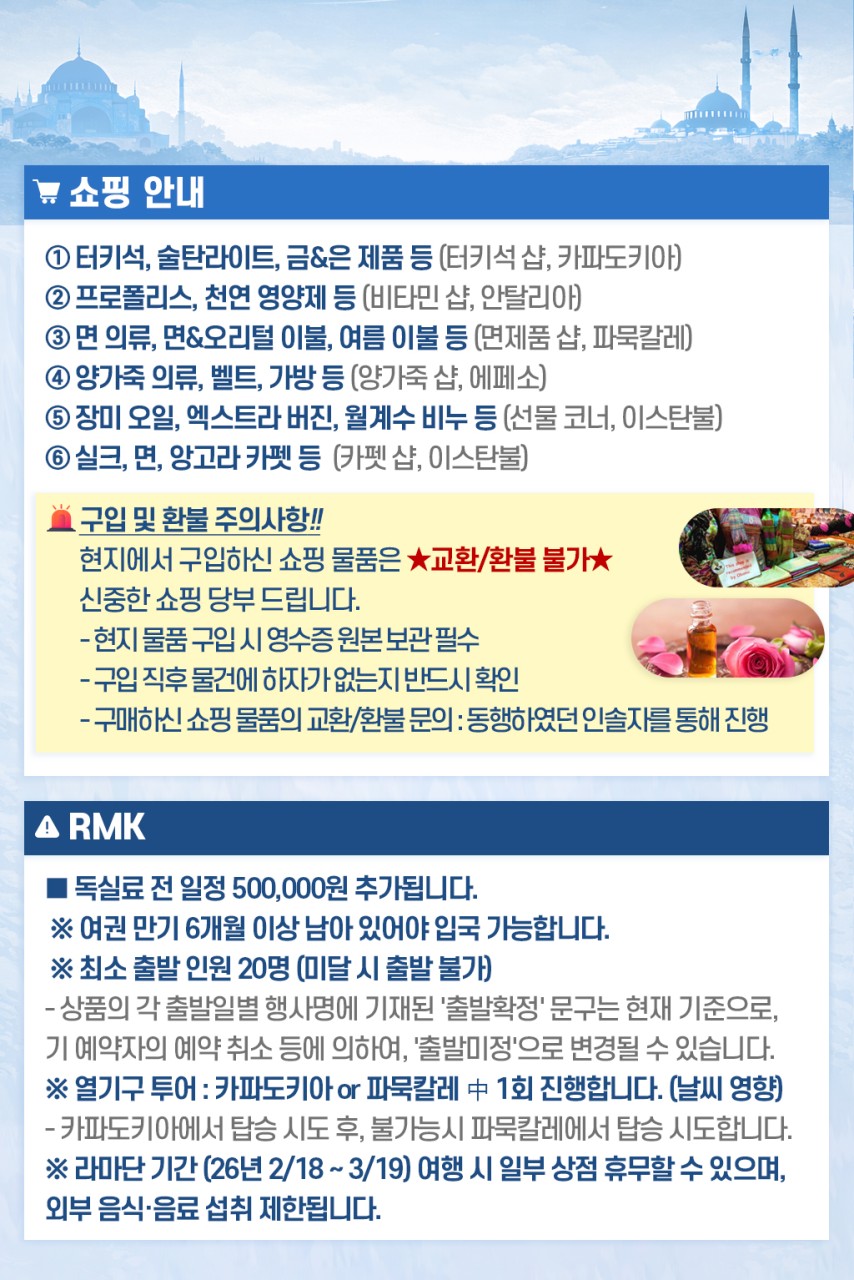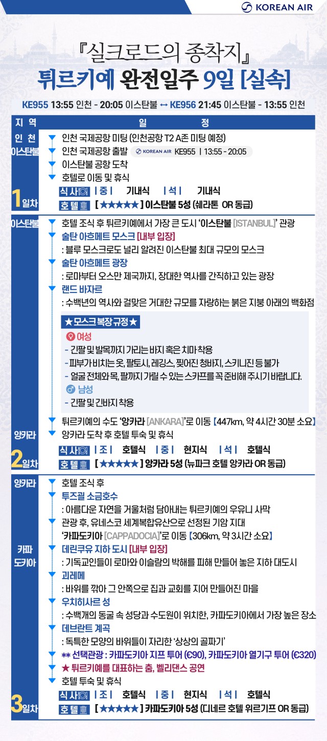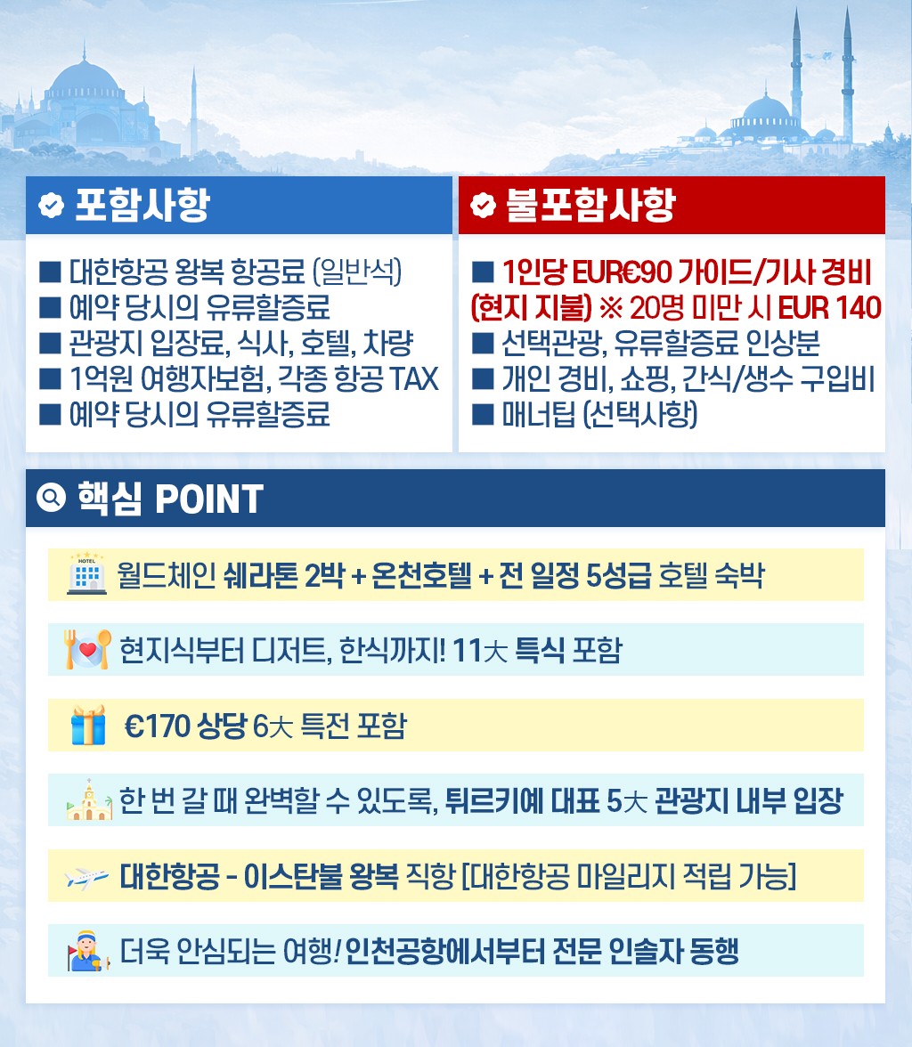 | 📢참고사항 『실크로드의 종착지』 튀르키예 완전일주 9일 3월 ~10월 출발 ! 1,499,000~ 유라시아의 중심이자 형제의 나라! 튀르키예를 완벽히 돌아볼 수 있는 최적의 상품 🛫 이스탄불(IN) ➡ 앙카라 ➡ 카파토키아 ➡ 안탈리아 ➡ 파묵칼레 ➡ 쉬린제 ➡ 에페수스 ➡ 아이발릭 ➡ 이스탄불(OUT) 🛬여행은 싸다고 좋은 게 아니라, 잘 만든 게 좋은 거 아시죠? 대한항공 국적기로 떠나는 튀르키예 ✈ ❤💛💚💜🧡💙🤎🤍🖤 한 나라에서 ✔️ 유럽 분위기 ✔️ 중동 감성 ✔️ 고대 유적 ✔️ 비현실적인 자연 이게 한 번에 겹쳐지는 나라 "튀르키예" 👉 도시, 자연, 유적이 하루 단위로 바뀌면서 여행의 온도가 매일 달라집니다. ❤💛💚💜🧡💙🤎🤍🖤 ✨핵심 POINT !! ✨ ✅ 월드체인 쉐라톤 포함! 온천호텔 & 전 일정 5성급 호텔 숙박 ✅★인솔자 동행★으로 출국부터 귀국까지 안심되는 여행 ✅ 현지식부터 디저트, 한식까지! ★11大 특식★ ① 쉬쉬 케밥 ② 항아리 케밥 ③ 아다나 케밥 ④ 생선구이 케밥 ⑤ 쿄프테 ⑥ 타욱 철판 볶음 ⑦ 피데 ⑧ 양갈비 피르졸라 ⑨ 시미트⑩ 로쿰&차이 ⑪ 비빔밥 or 닭계장 ✅170유로 상당 ★6大 특전 포함★ ① 알록달록한 건물들과 이국적인 풍경, 튀르키예의 떠오르는 관광지 발랏 지구 관광 ② 튀르키예를 대표하는 춤, 벨리댄스 공연 감상 ③ 유라시아를 연결하는 관문 위, 보스포러스 해협 크루즈 탑승 ④ 구시가지와 보스포러스 해협을 한눈에 담을 수 있는 피엘로티 언덕 케이블카 탑승 ⑤ 파묵칼레 온천 족욕 후 이용할 수 있도록 목화 손수건 제공 ⑥ 유럽의 석회수로부터 피부를 보호할 수 있도록 아르간 핸드크림 제공 ✅★튀르키예 대표 5大 관광지 내부입장★ ① 블루 모스크: 푸른빛의 타일을 자랑하는 이스탄불 최대 규모의 모스크 ② 톱카프 궁전: 보스포러스 해협이 내려다보이는 오스만 제국의 심장 ③ 데린쿠유 지하도시: 기독교인들이 로마와 이슬람의 박해를 피해 만들어 놓은 지하 대도시 ④ 히에라폴리스: 그리스 로마 신화와 기독교 건축물이 공존하는 튀르키예 최고의 유적지 ⑤ 에페수스 유적지: 동서양 및 기독교 역사에서 빼놓을 수 없는 세계적으로 중요한 도시 유적 ※ 여권 만기 6개월 이상 남아 있어야 입국이 가능합니다. ※ 본 상품의 최소출발인원은 <20명 이상>으로, 20명 이상 예약 시 출발이 최종 확정됩니다. |