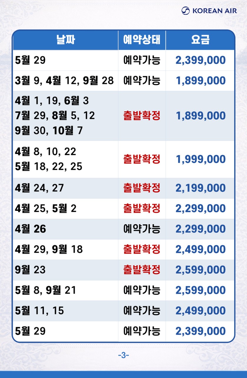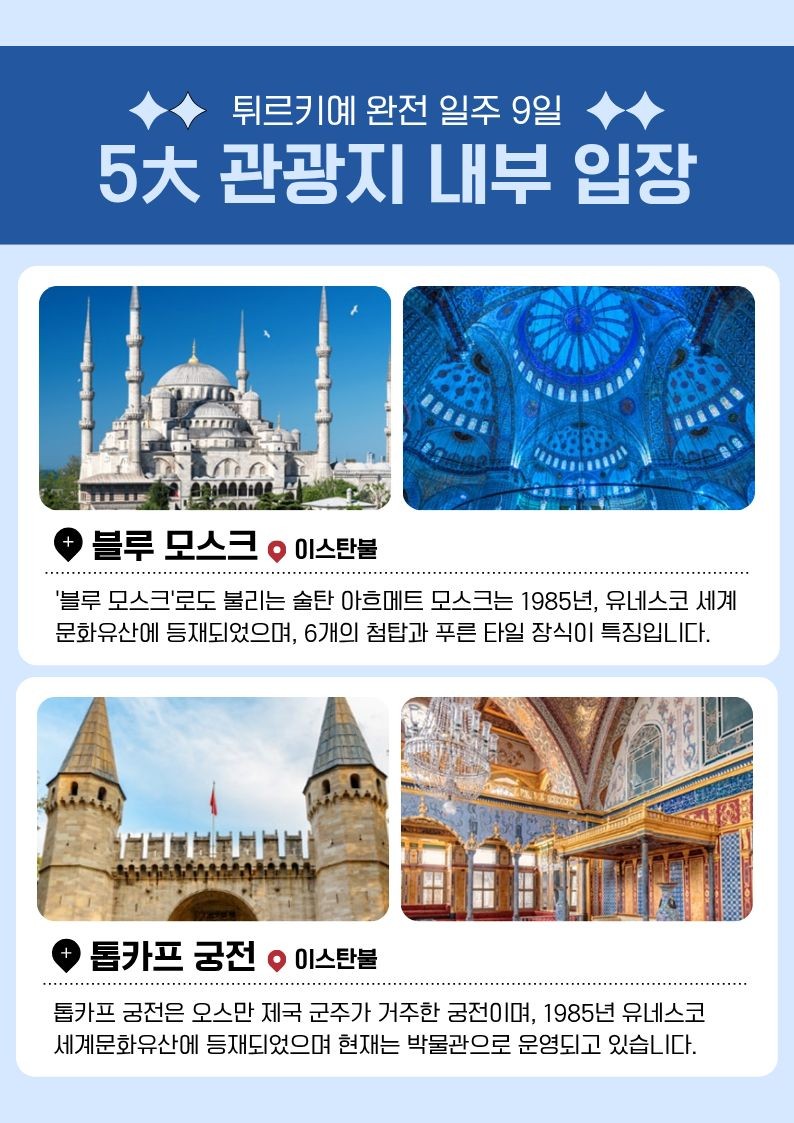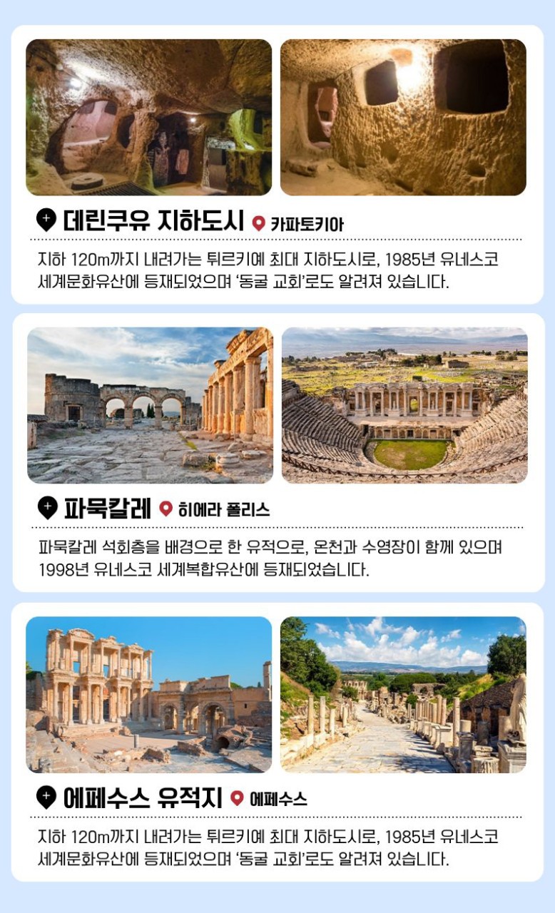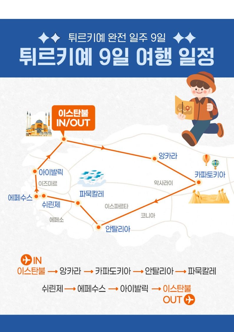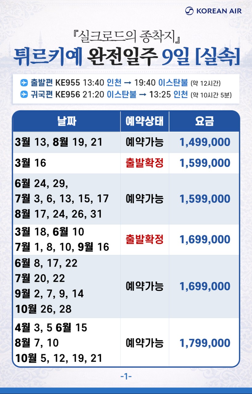 | 📢참고사항 『실크로드의 종착지』 튀르키예 완전일주 9일 3월 ~10월 출발 ! 1,499,000~ 유라시아의 중심이자 형제의 나라! 튀르키예를 완벽히 돌아볼 수 있는 최적의 상품 🛫 이스탄불(IN) ➡ 앙카라 ➡ 카파토키아 ➡ 안탈리아 ➡ 파묵칼레 ➡ 쉬린제 ➡ 에페수스 ➡ 아이발릭 ➡ 이스탄불(OUT) 🛬여행은 싸다고 좋은 게 아니라, 잘 만든 게 좋은 거 아시죠? 대한항공 국적기로 떠나는 튀르키예 ✈ ❤💛💚💜🧡💙🤎🤍🖤 한 나라에서 ✔️ 유럽 분위기 ✔️ 중동 감성 ✔️ 고대 유적 ✔️ 비현실적인 자연 이게 한 번에 겹쳐지는 나라 "튀르키예" 👉 도시, 자연, 유적이 하루 단위로 바뀌면서 여행의 온도가 매일 달라집니다. ❤💛💚💜🧡💙🤎🤍🖤 ✨핵심 POINT !! ✨ ✅ 월드체인 쉐라톤 포함! 온천호텔 & 전 일정 5성급 호텔 숙박 ✅★인솔자 동행★으로 출국부터 귀국까지 안심되는 여행 ✅ 현지식부터 디저트, 한식까지! ★11大 특식★ ① 쉬쉬 케밥 ② 항아리 케밥 ③ 아다나 케밥 ④ 생선구이 케밥 ⑤ 쿄프테 ⑥ 타욱 철판 볶음 ⑦ 피데 ⑧ 양갈비 피르졸라 ⑨ 시미트⑩ 로쿰&차이 ⑪ 비빔밥 or 닭계장 ✅170유로 상당 ★6大 특전 포함★ ① 알록달록한 건물들과 이국적인 풍경, 튀르키예의 떠오르는 관광지 발랏 지구 관광 ② 튀르키예를 대표하는 춤, 벨리댄스 공연 감상 ③ 유라시아를 연결하는 관문 위, 보스포러스 해협 크루즈 탑승 ④ 구시가지와 보스포러스 해협을 한눈에 담을 수 있는 피엘로티 언덕 케이블카 탑승 ⑤ 파묵칼레 온천 족욕 후 이용할 수 있도록 목화 손수건 제공 ⑥ 유럽의 석회수로부터 피부를 보호할 수 있도록 아르간 핸드크림 제공 ✅★튀르키예 대표 5大 관광지 내부입장★ ① 블루 모스크: 푸른빛의 타일을 자랑하는 이스탄불 최대 규모의 모스크 ② 톱카프 궁전: 보스포러스 해협이 내려다보이는 오스만 제국의 심장 ③ 데린쿠유 지하도시: 기독교인들이 로마와 이슬람의 박해를 피해 만들어 놓은 지하 대도시 ④ 히에라폴리스: 그리스 로마 신화와 기독교 건축물이 공존하는 튀르키예 최고의 유적지 ⑤ 에페수스 유적지: 동서양 및 기독교 역사에서 빼놓을 수 없는 세계적으로 중요한 도시 유적 ※ 여권 만기 6개월 이상 남아 있어야 입국이 가능합니다. ※ 본 상품의 최소출발인원은 <20명 이상>으로, 20명 이상 예약 시 출발이 최종 확정됩니다. |